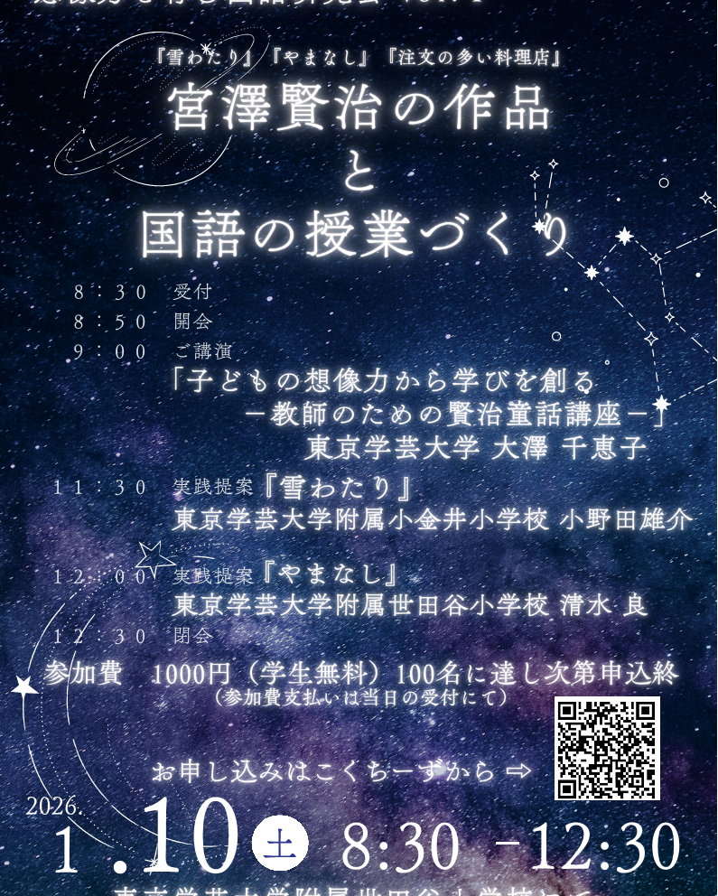 東京学芸大学附属世田谷小学校国語部が主催する研究会です。2つの公開授業、協議会、提案を通して、国語科授業づくりを考える研究会です。